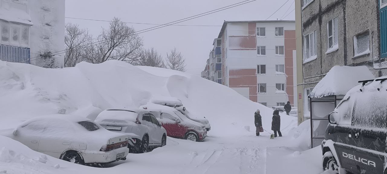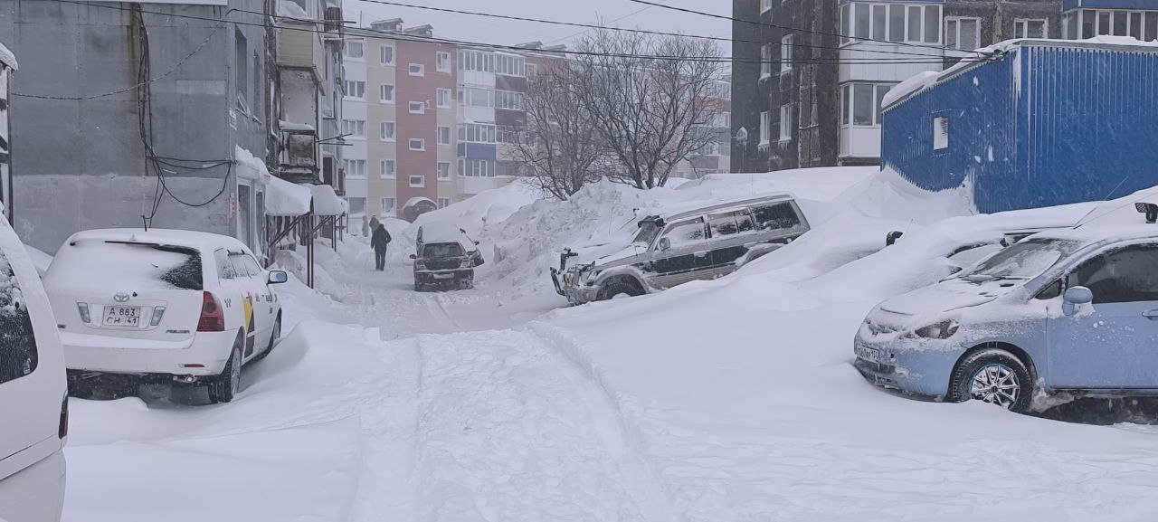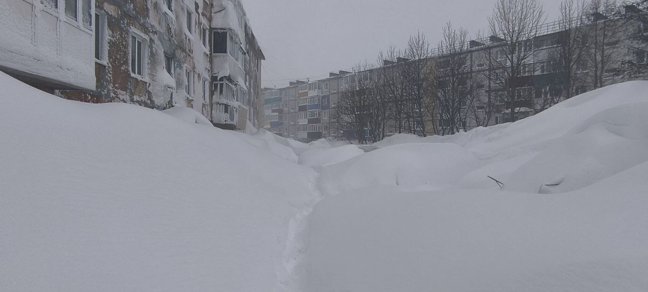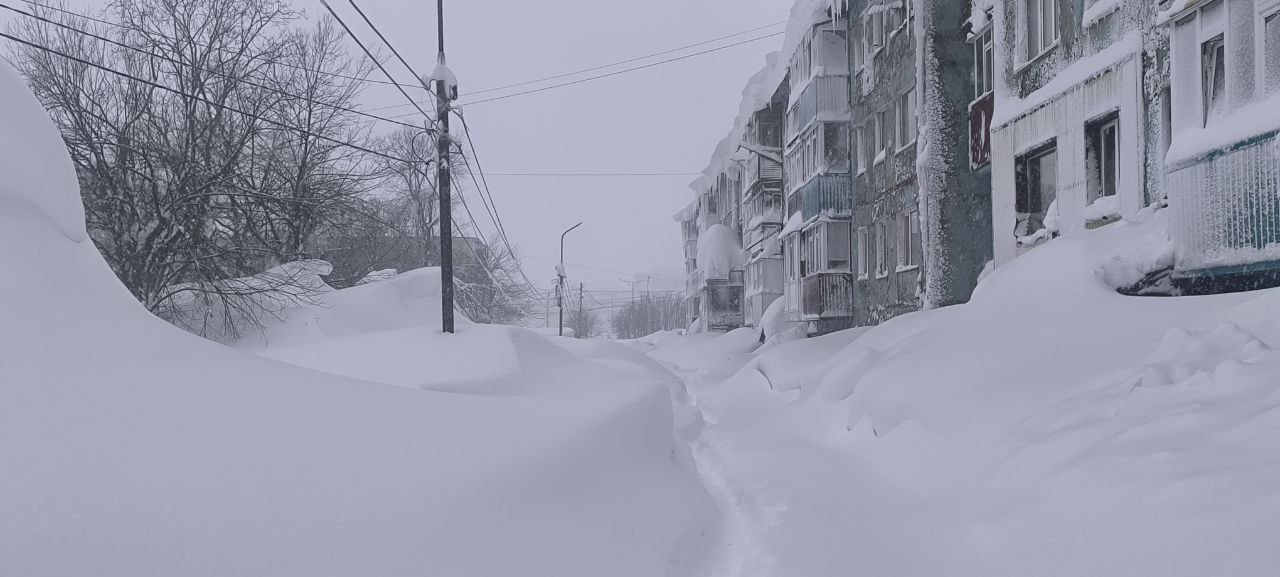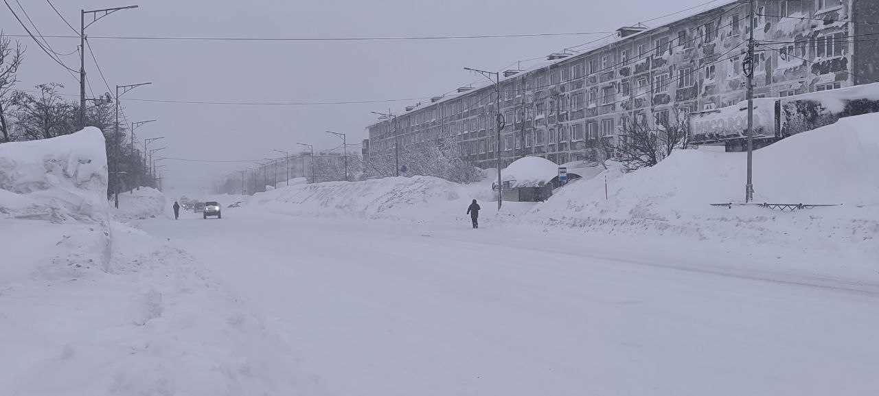 "В Петропавловске-Камчатском снег валит хлопьями, заметая дворы и превращая улицы в белые лабиринты. Главные дороги расчищены, но вдоль них — сугробы высотой по третий этаж.Одинокие прохожие - словно герои северных легенд.