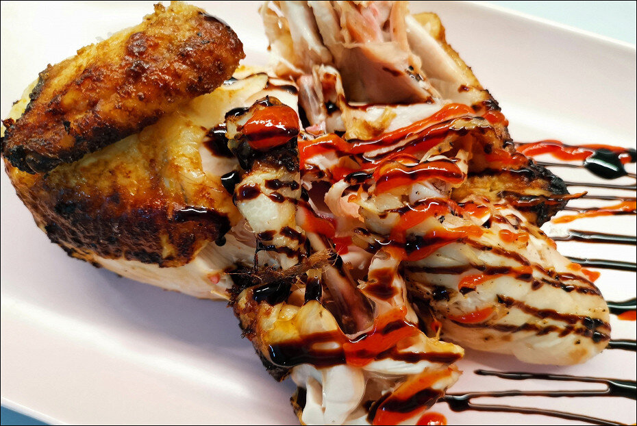8. Как только курочка будет готова, дайте ей немного остыть, а затем нарежьте на части. Для пикантности можно дополнить блюдо соусом чили и бальзамическим кремом.