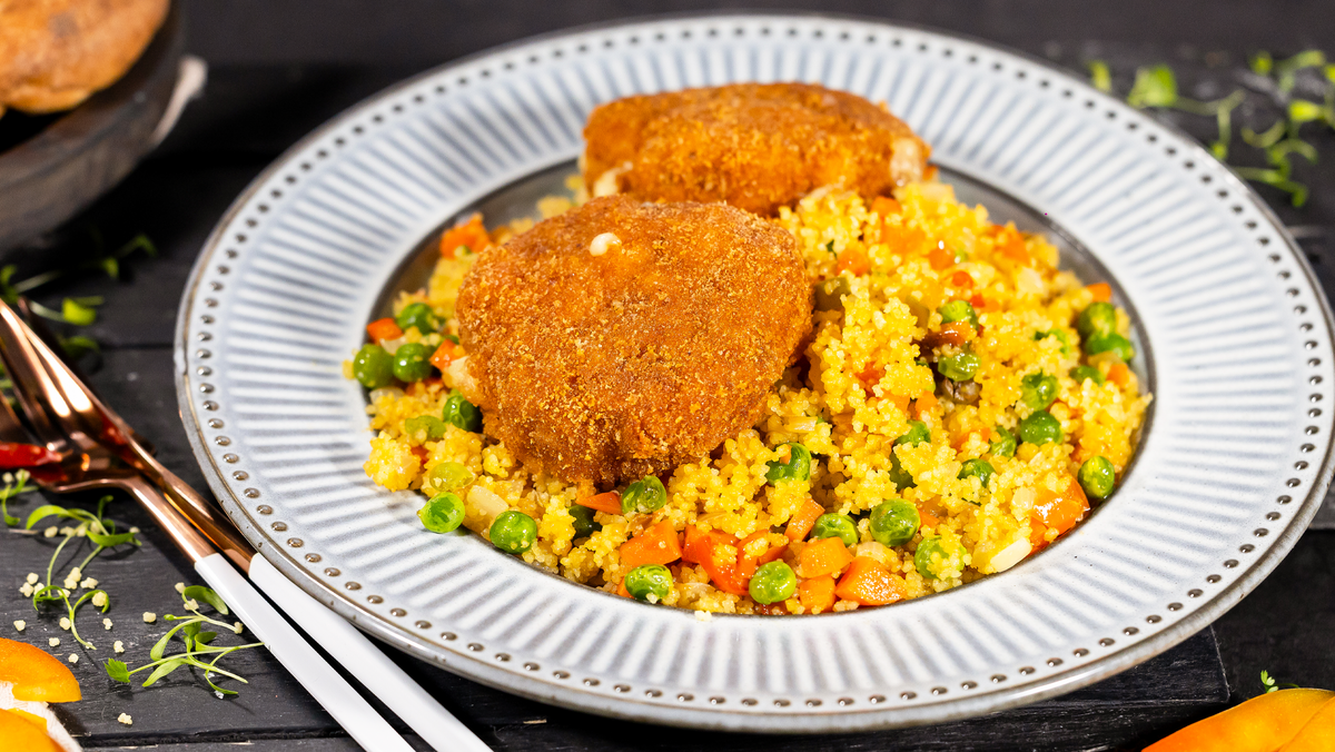 Мелко нарезать лук, морковь и сладкий перец, а также сыр.Куриную грудку и бедра нарезать крупными кубиками и поместить в блендер вместе с 30 г сливочного масла, измельчив до однородной массы.В глубокой миске соединить получившийся фарш с овощами, сыром, базиликом, солью и перцем. Тщательно перемешать и отбить об миску для лучшей консистенции.Сформировать из фарша биточки. Чтобы они лучше держали форму, смазать руки растительным маслом. Яйцо взбить с небольшим количеством воды и обвалять биточки в панировке дважды — сначала в яйце, затем в сухарях.Разогреть сковороду с растительным маслом и обжарить биточки до золотистой корочки. После обжаривания закладывать их на противень и отправить в разогретую до 170°C духовку на 10 минут.На отдельной сковороде обжарить овощи (лук, морковь и перец) до мягкости, затем добавить к ним горошек и кускус, влить воду, перемешать и накрыть крышкой. Дать настояться 5 минут.На тарелку выложить кускус с овощами, а сверху разместить горячие биточки. Это простое, но изысканное блюдо станет вашим любимым перекусом и поднимет настроение в любой ситуации!