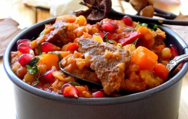 После этого налейте воду, дайте мясу потушиться, а затем добавьте томатную пасту, сахар и солите по вкусу. Когда мясо будет готово, добавьте чечевицу, убедившись, что она полностью покрыта водой, а спустя пять минут добавьте кубики тыквы. Дайте всему этому потушиться еще около десяти минут.