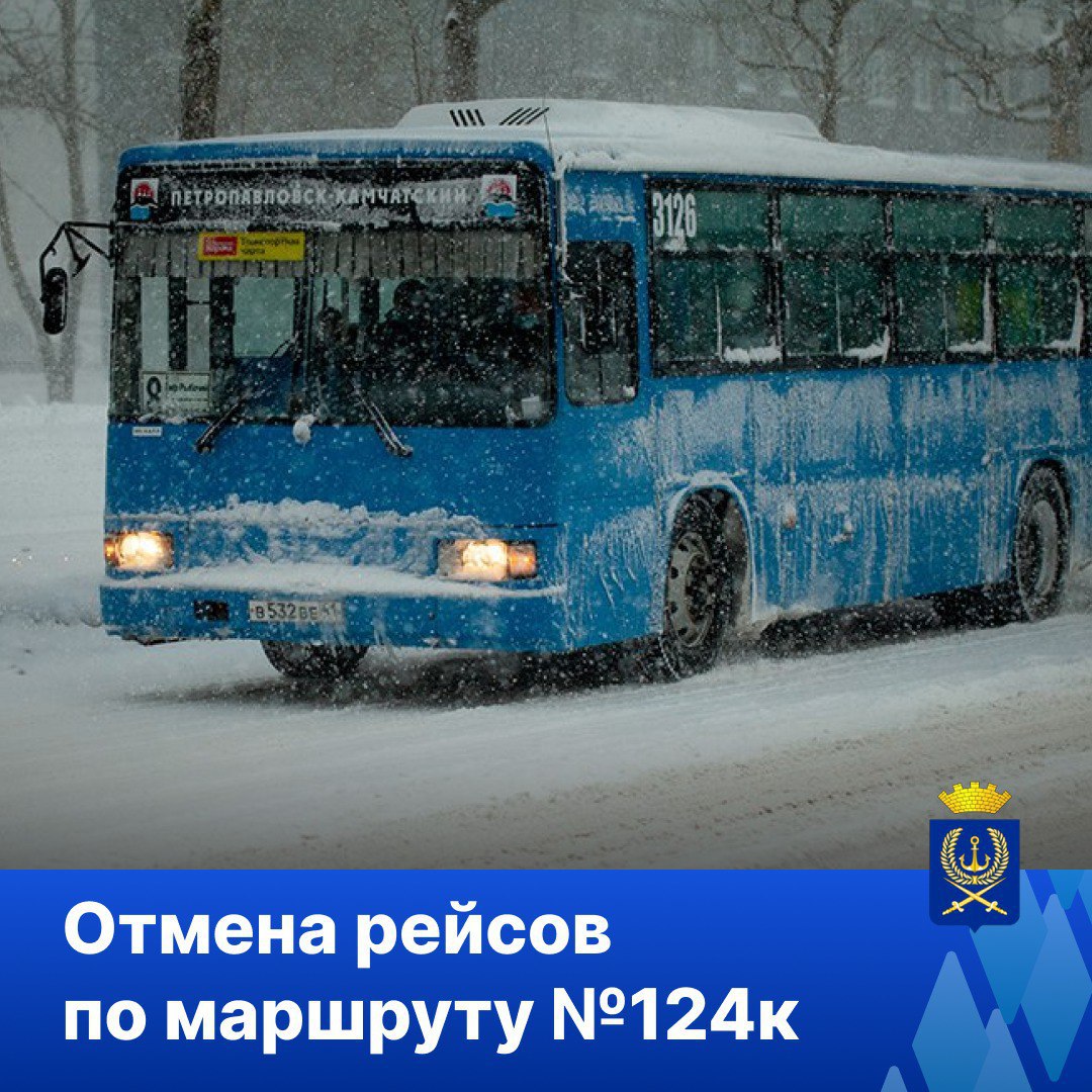 Внимание! Отмена рейсов. Из-за сложной дорожной обстановки в Петропавловске-Камчатском отменены некоторые рейсы по маршруту №124к: • Вилючинск: 10:30, 12:00