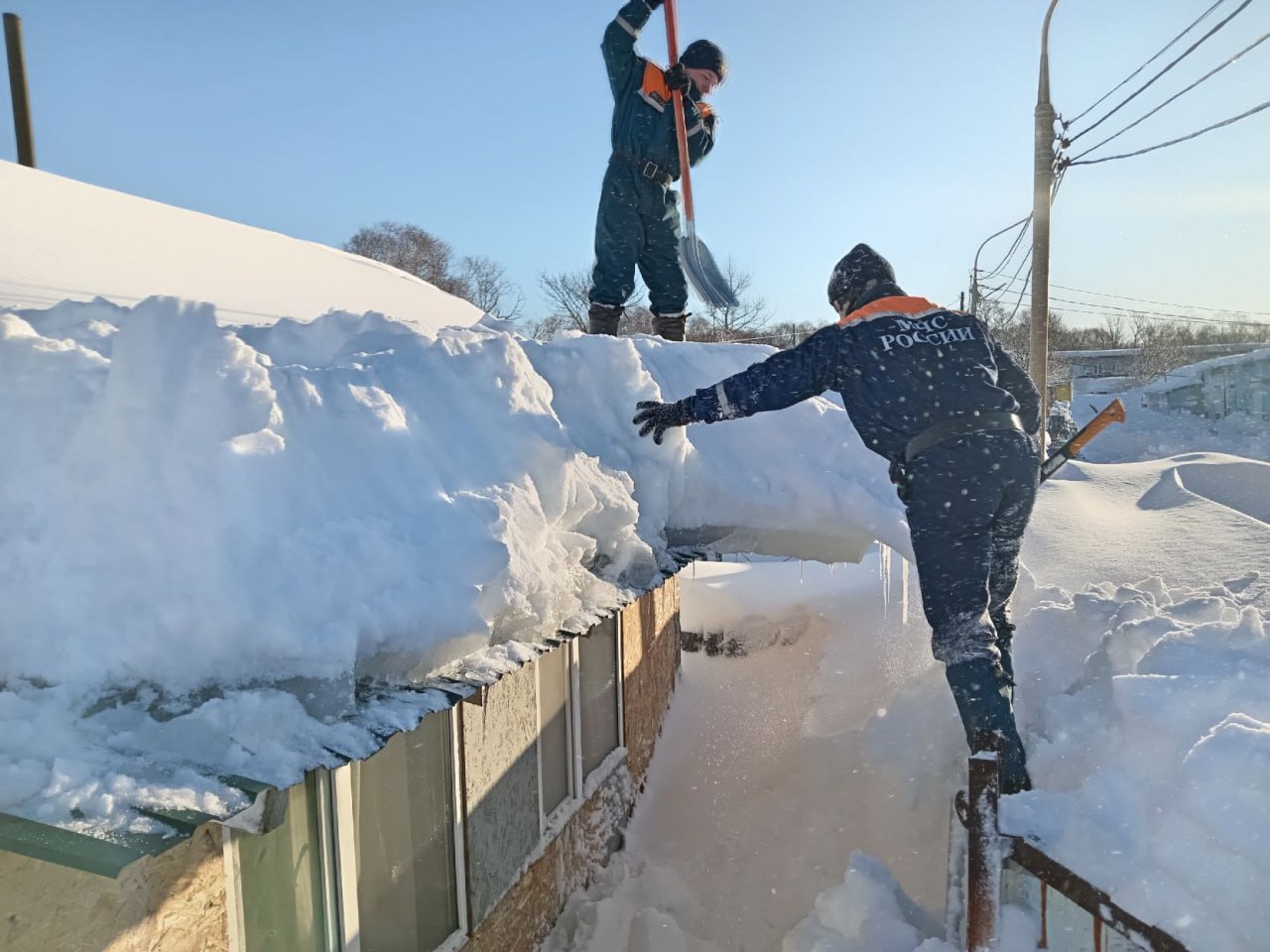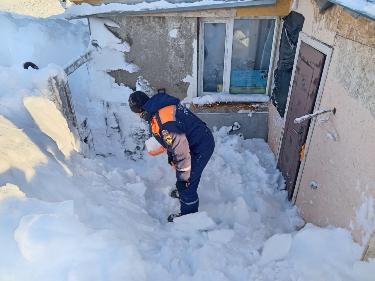 Сотрудники Камчатского спасательного центра МЧС России расчищают пенсионеру частный дом по ул. Колхозной.