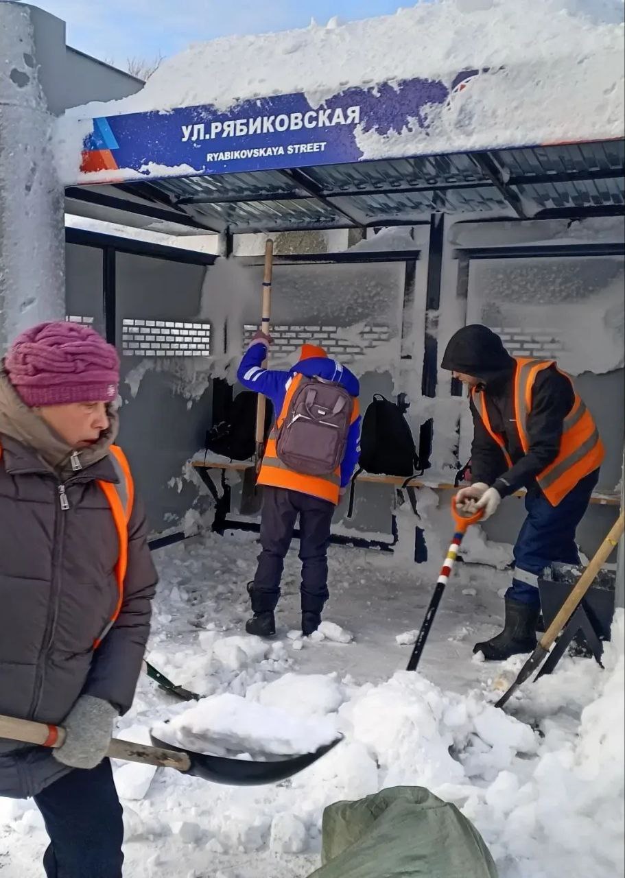 Бригады ручного труда очищают от снега тротуары по ул. Ленинградская, а также автобусные остановки и прилегающие к ним территории в Ленинском районе.