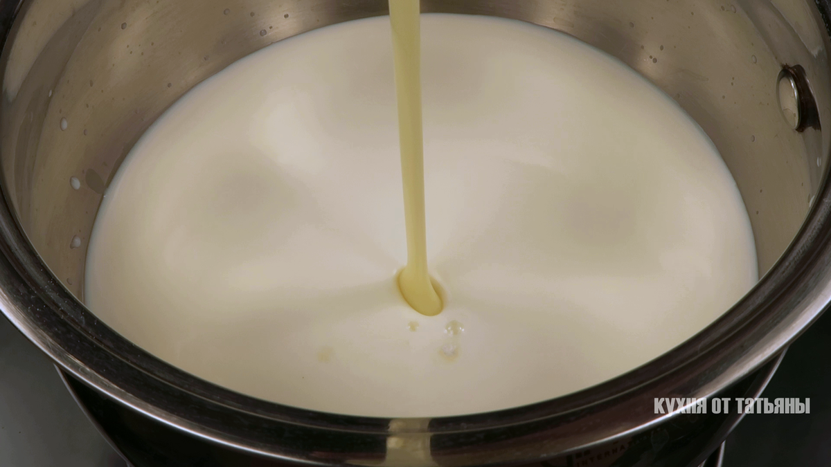 Первым шагом является подготовка смеси: в кастрюлю наливают молоко, добавляют сгущенное молоко и ванильный сахар. Все тщательно перемешивается до однородности.