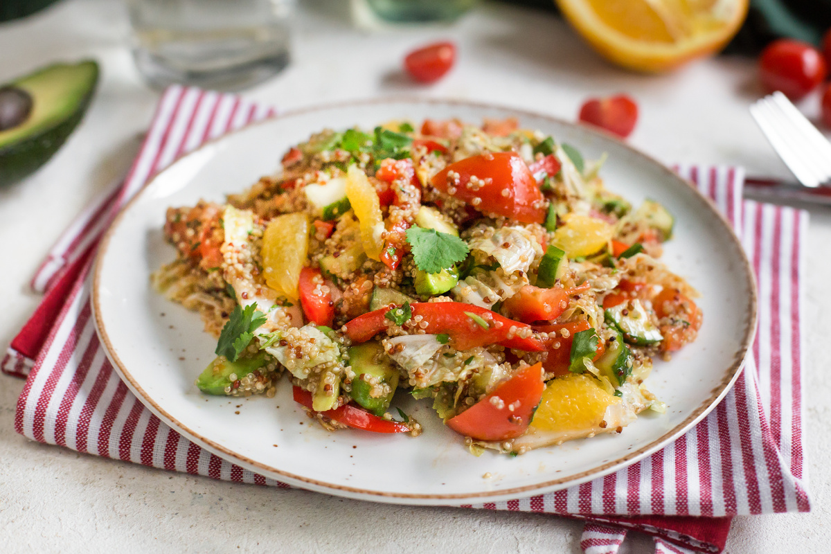 Смешивание происходит в конце, чтобы сохранить хрустящие огурцы и свежесть авокадо, а дольки апельсина добавляют яркую цитрусовую ноту, не перебивая остальное.