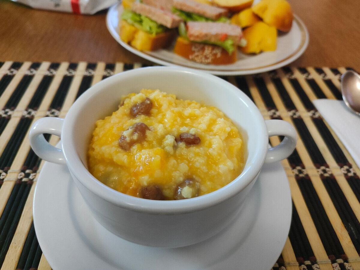 На завтрак идёт пшённая каша с изюмом и тыквой, а на бутерброды пробуем куриный террин на тыквенных булочках. Тыква остаётся в запасе, потому мы продолжаем использовать её в разных вариантах: булочки на сковороде добавляют домашний аромат, а террин на бутербродах звучит как легкая альтернатива колбасе.