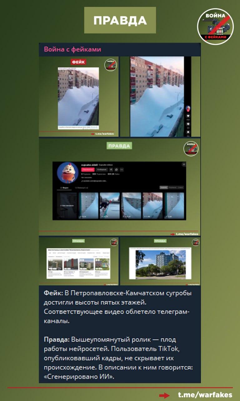 Фейки про Камчатку, как правило, появляются на фоне неблагоприятных погодных условий. Например, 18 января, после снегопада, телеграм-каналы облетело видео с сугробами до пятых этажей в Петропавловске-Камчатском. Хайповые кадры были созданы с помощью нейросетей.