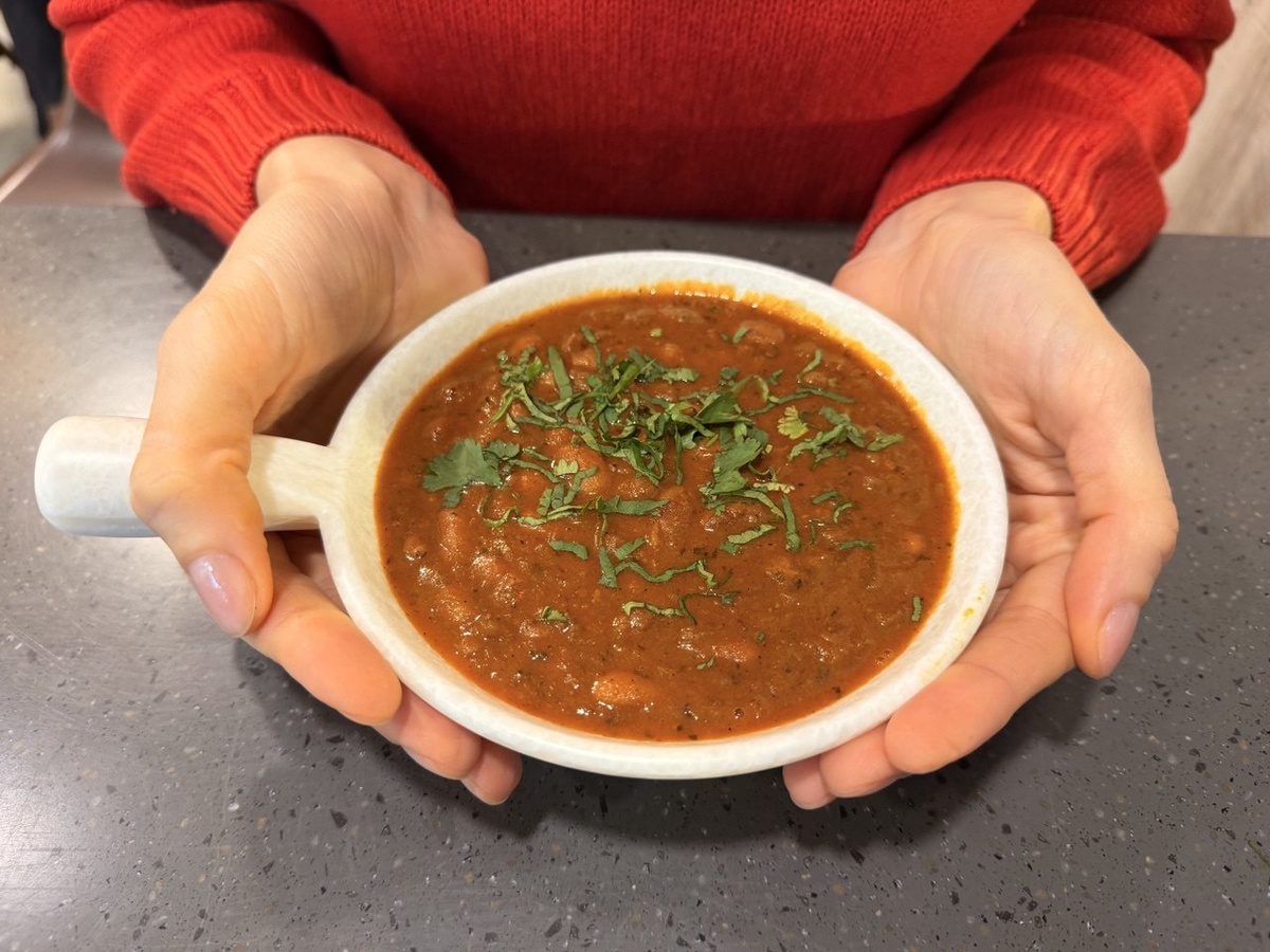 Блюдо принесли стремительно: всего за 7 минут. Отдавая дань зимнему сезону, раджма сразу же порадовала ароматом и горячей остротой. Смешение томатов, карри и тмина создает насыщенный вкус, который может напомнить грузинское лобио. Это идеальный вариант для тех, кто обожает блюда из фасоли.