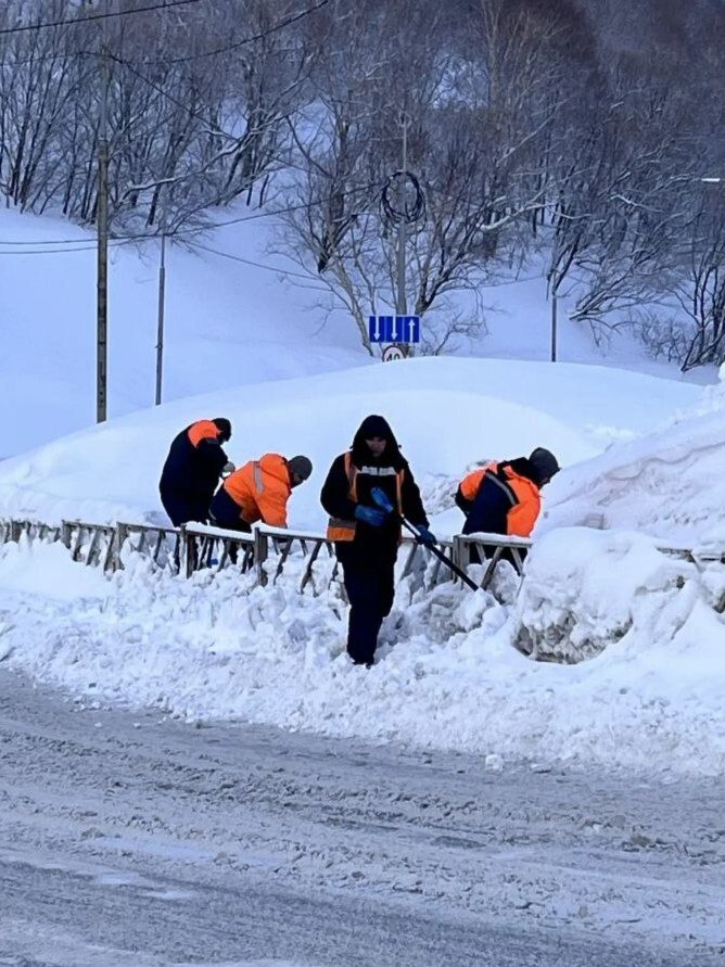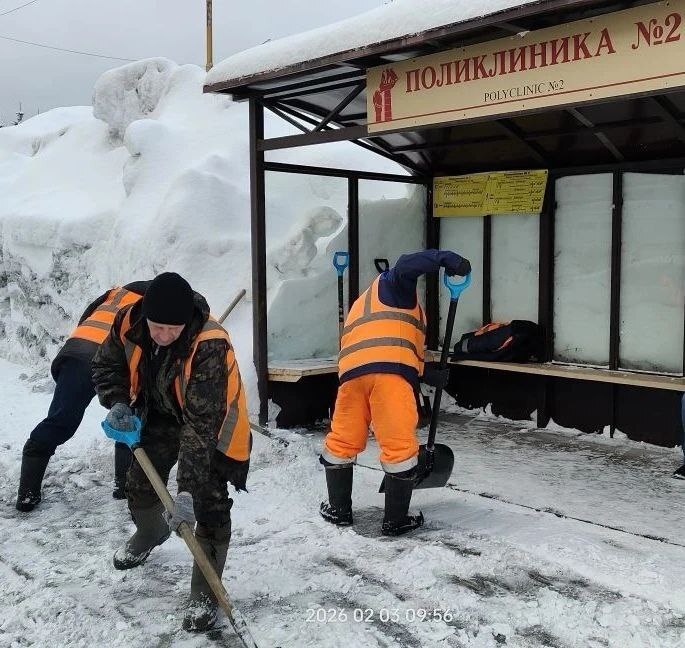 Бригады ручного труда очищают от снега тротуары по ул. Набережная, а также автобусные павильоны и прилегающие к ним территории на улицах Сахалинская и Индустриальная.