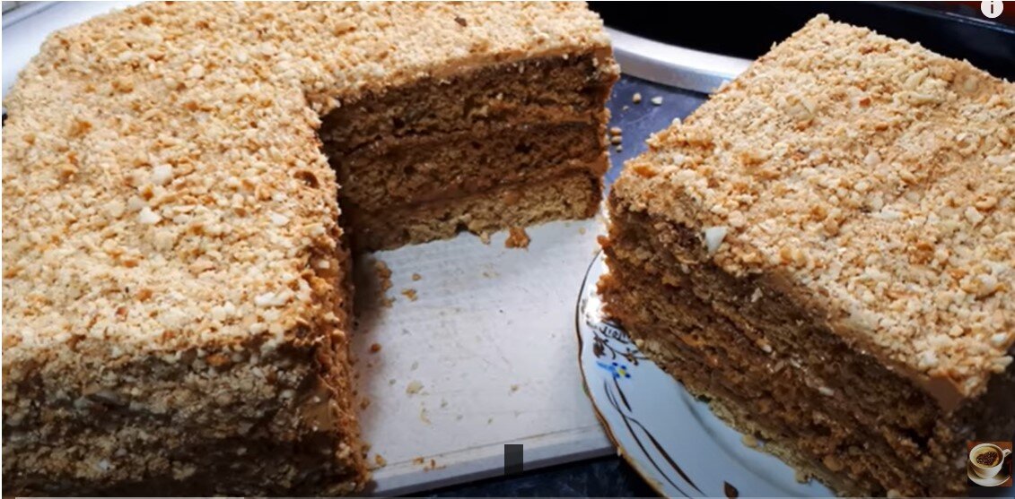 Для пропитки коржей понадобится сироп. Рецепт прост: смешиваем мед, воду и немного коньяка по желанию. После того как коржи остывают, их следует смазать пропиткой и укрыть кремом, а для завершения оформления посыпать верх и бока торта орехами.