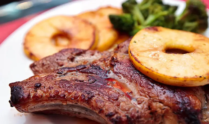 При подаче свинину можно украсить запеченными яблоками и смазать сливочным маслом для дополнительного аромата.
