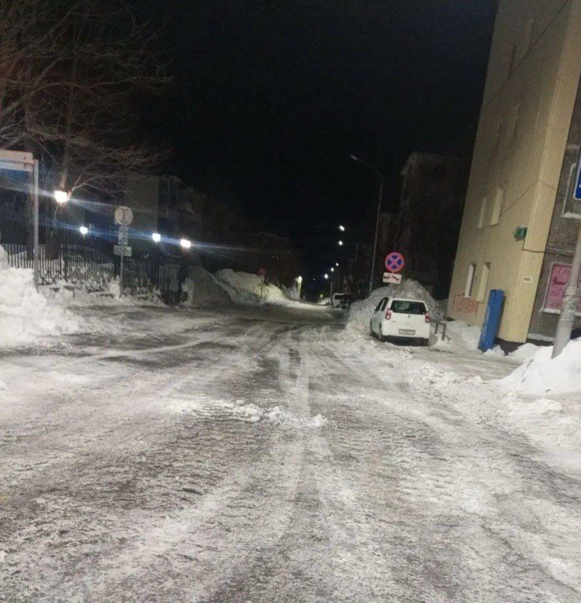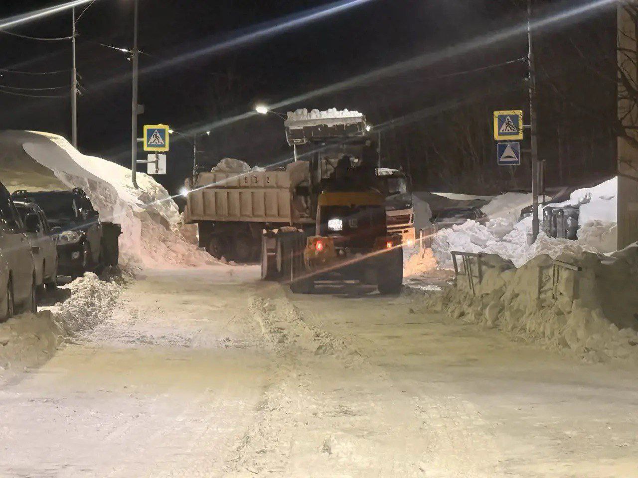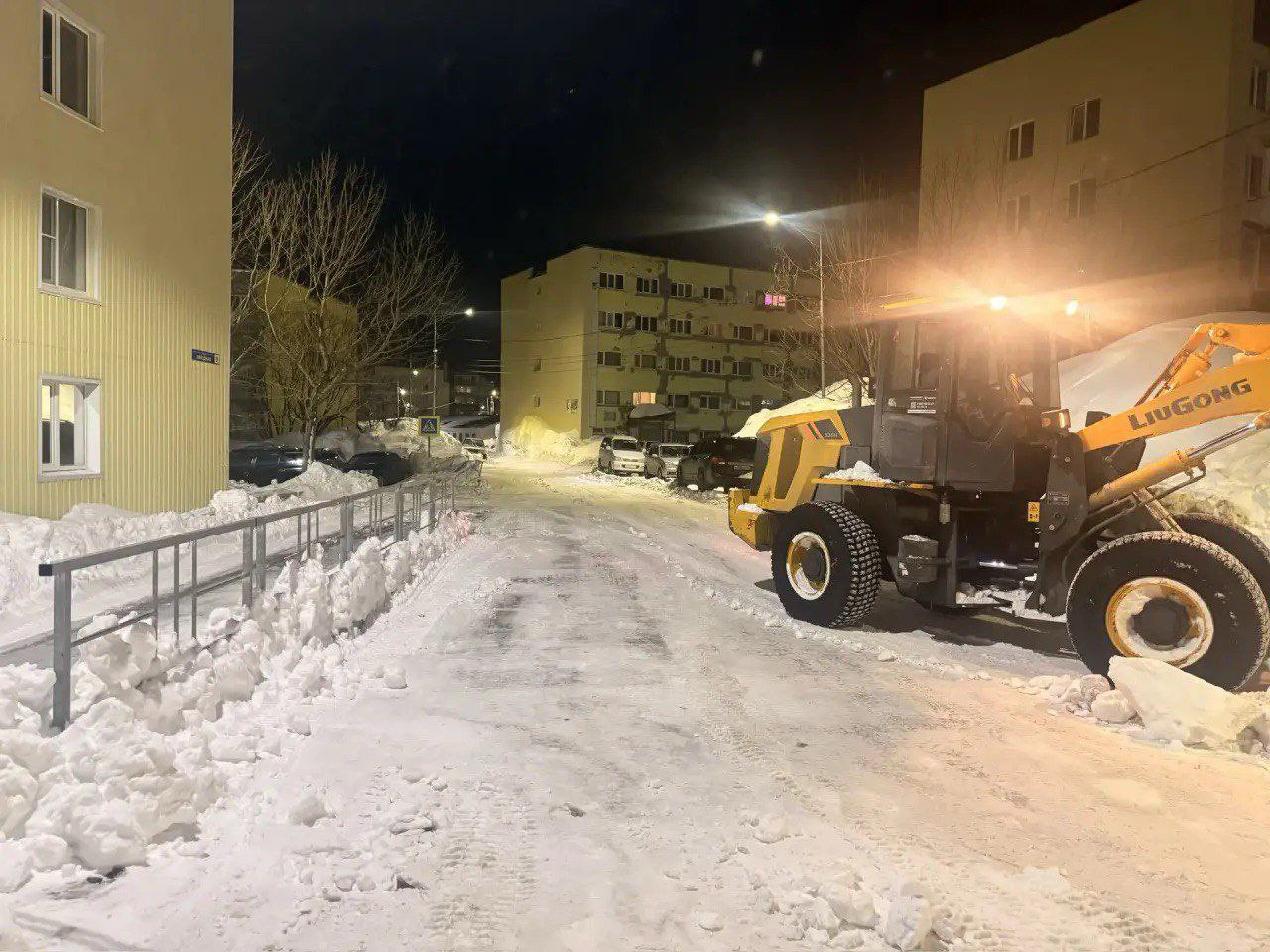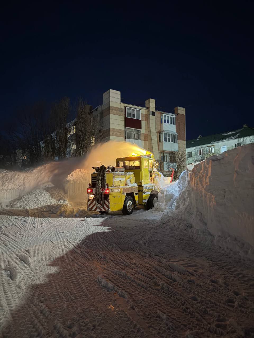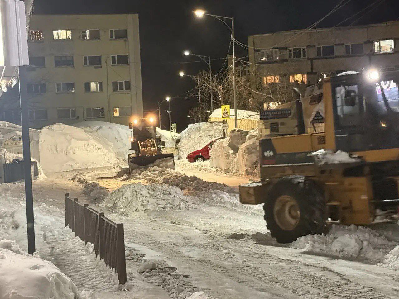 Дорожные службы в ночную смену продолжают расчистку и расширение внутриквартальных проездов и придомовых территорий.