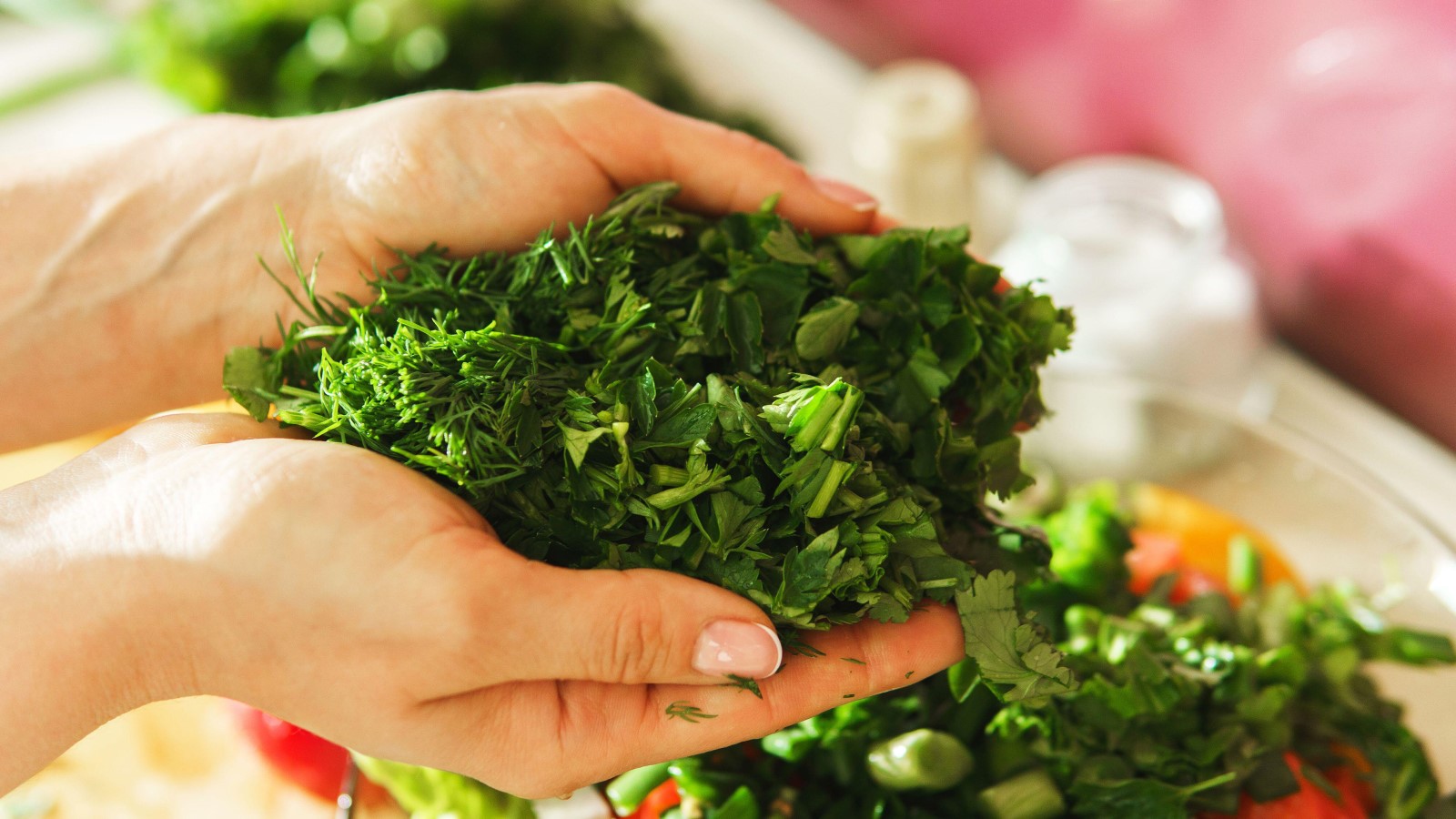 Например, можно в два счета отделить листья зелени от стеблей. Для этого промойте веточки и просушите. В поверхность с крупными дырками поместите стебли так, чтобы листья были с внешней стороны.