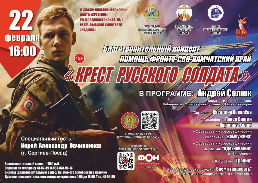 Приглашаем вас на благотворительный концерт «Крест русского солдата», посвященный Дню защитника Отечества. Мероприятие организовано в поддержку воинов, участвующих в специальной военной операции.
