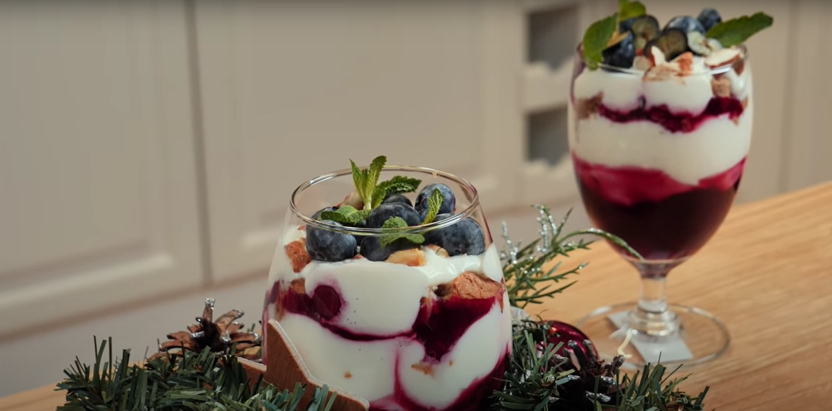 Для финального акцента посыпьте десерт обжаренным миндалем, голубикой и свежей мятой. Ваш трайфл готов к подаче на стол!