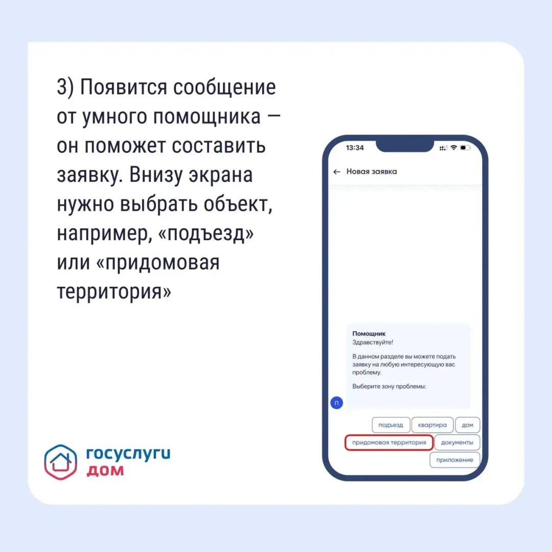 Воспользуйтесь приложением «Госуслуги. Дом». Это самый удобный и быстрый способ отправить заявку: фото и описание проблемы сразу уйдут ответственным лицам.