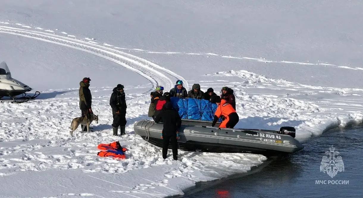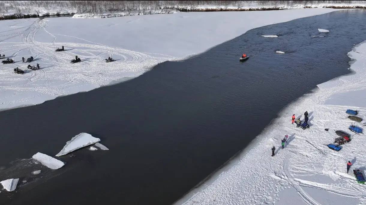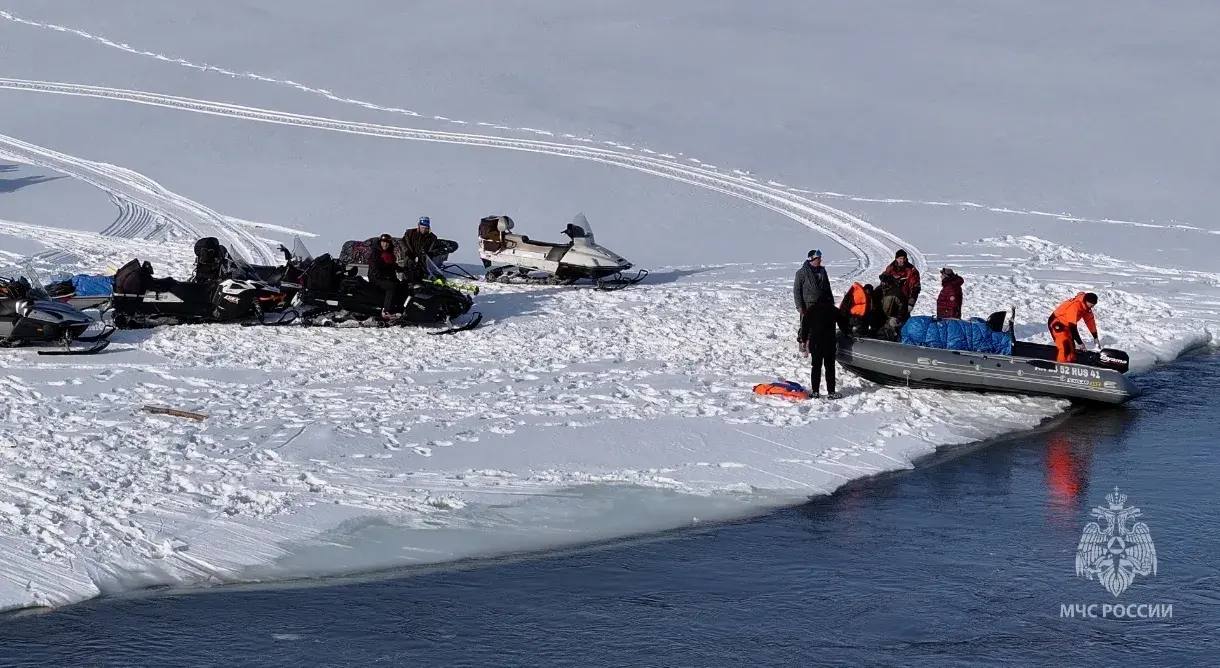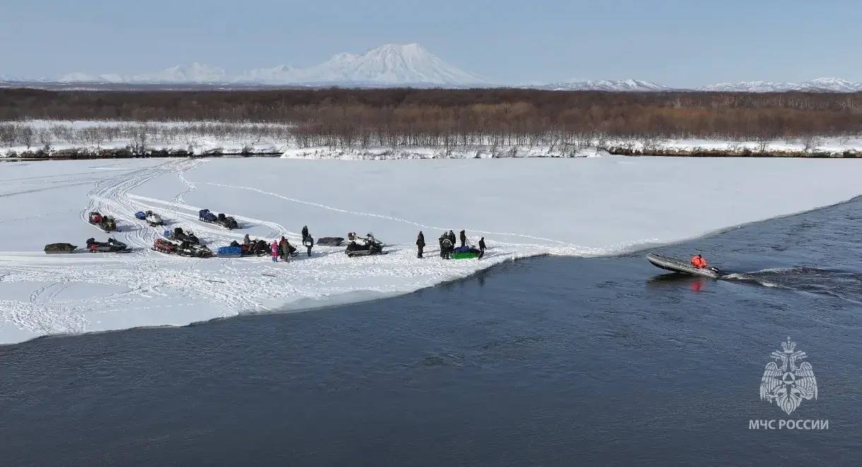 Напомним, экстремалы, возвращаясь домой с озера Калыгирь, не смогли перебраться на снегоходах на противоположный берег реки Налычево, так как ледяной переезд смыло.