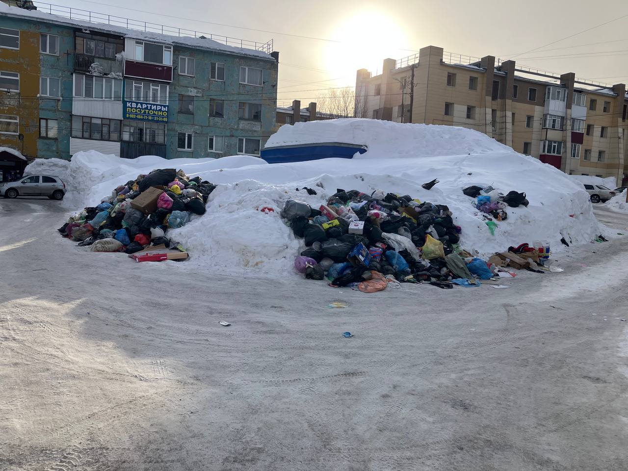 На фотографии, присланной в редакцию kamchatka.aif.ru, видно, что подъездные пути и большая часть двора расчищены от снега, однако в самом его центре сохраняется высокая снежная куча, на которой и вокруг которой скопились десятки пакетов с мусором. Вокруг валяются картонные коробки, пластиковые бутылки, пакеты из-под продуктов и другие отходы. Птицы уже разрывают пакеты в поисках еды, мусор разлетается по снегу.
