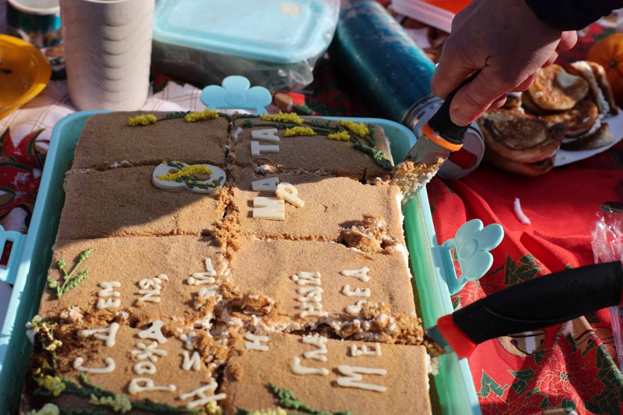 Главным угощением стал праздничный торт, который символизировал радость и сладость этого дня. А другая его половина стала сюрпризом — поздравление с юбилеем для руководителя клуба Николая Скурлатова!