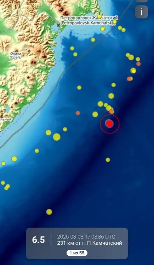 Ощутимое землетрясение магнитудой 6.5 произошло у берегов Камчатки