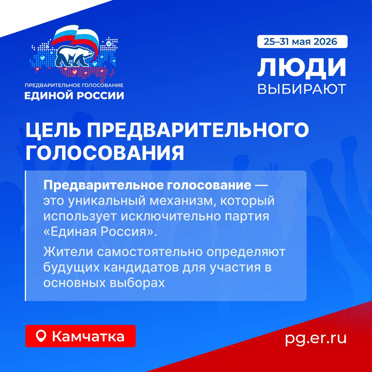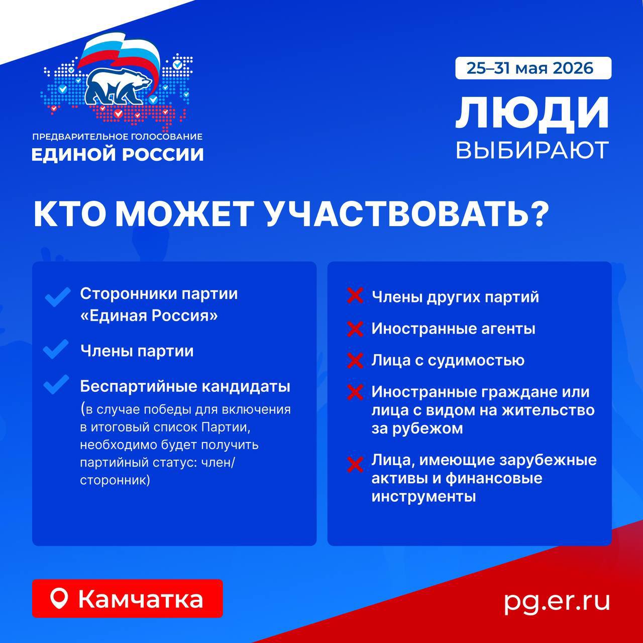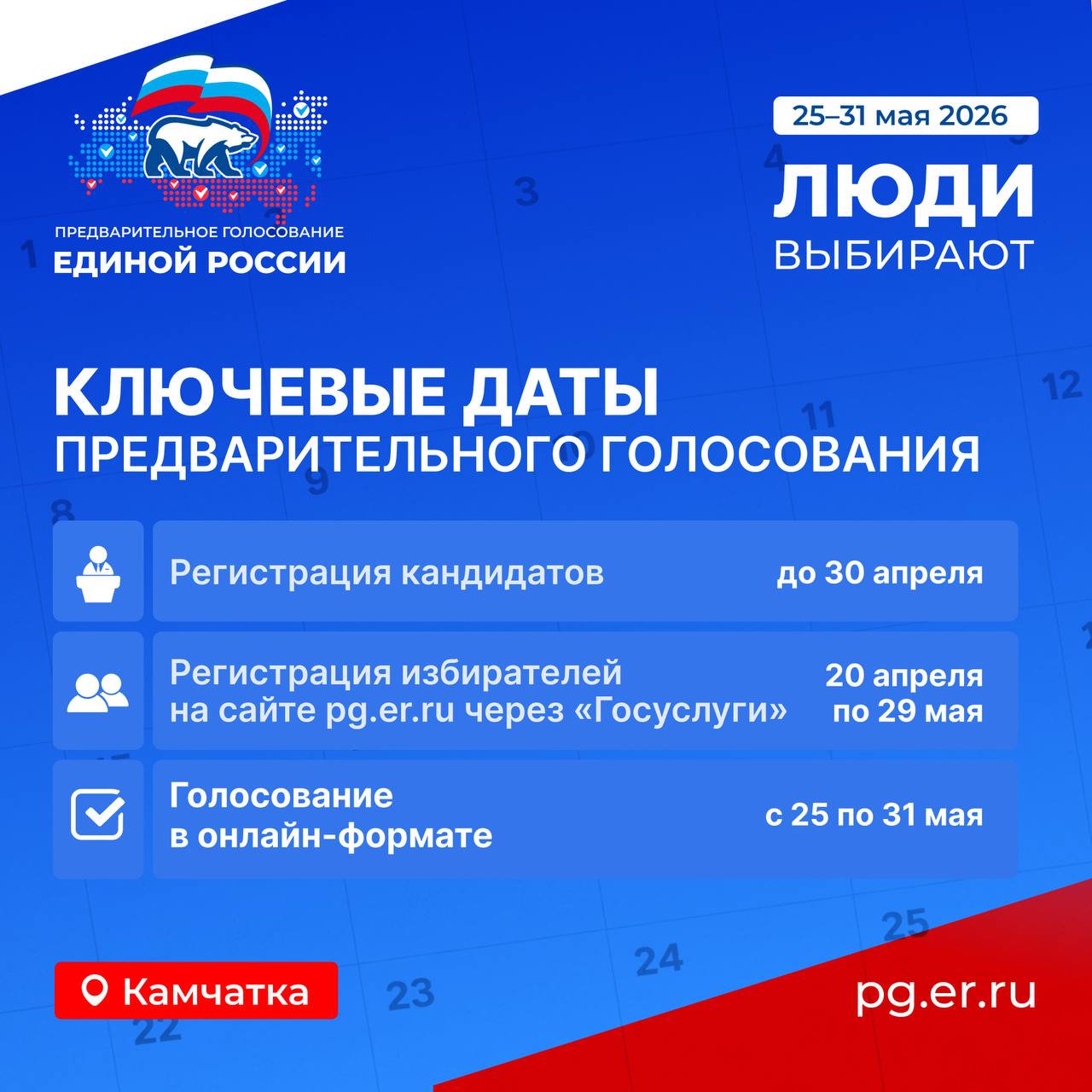 - С 20 апреля по 29 мая — регистрация избирателей на сайте pg.er.ru (авторизация через портал «Госуслуги»)