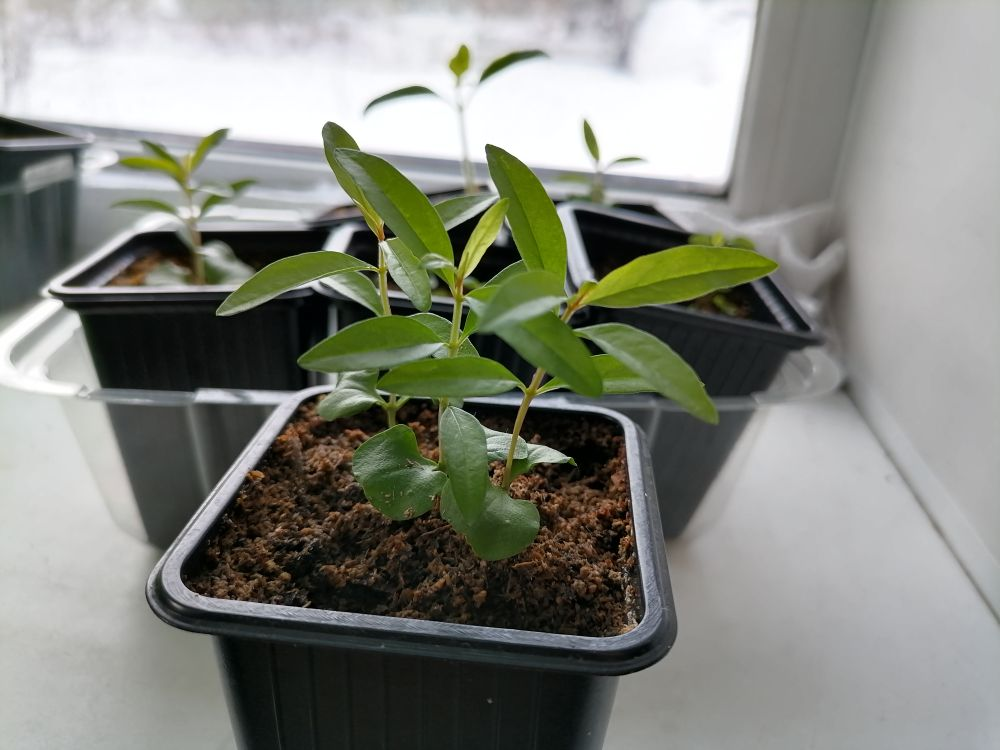 Гранат и киви - два представителя экзотического мира, которые прекрасно себя чувствуют в домашних условиях. Начиная с пяти семян граната, все пять взошли и уже готовы к пересадке - два из них ждут своей очереди в отдельной кастрюле. Киви, который также отлично взошел из девяти семян, радует глаз: шесть сильных кустиков прошли путь от семечка до всхода, хотя несколько более мелких загадочно исчезли.