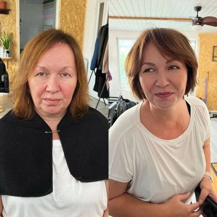 Перед преображением волосы обладали неопределенной длиной, что визуально «тянуло» черты лица вниз. Укороченная стрижка, такая как градуированный боб или каре с легким слоем, открыла шею и подбородок, создавая эффект лифтинга. Объем у корней придавал лицу дополнительную молодость.