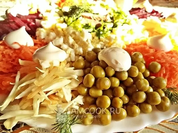 Майонез добавляют сверху на столе, чтобы сохранить эстетичный вид, а перемешивают его уже перед подачей, когда гости успели налюбоваться красотой блюда. В этом простом салате кроется настоящая кулинарная реликвия, полная тепла и аромата домашнего уюта.