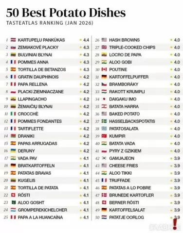 По версии экспертов, в рейтинге было представлено 50 различных картофельных блюд со всего мира, и этот успех белорусских драников стал настоящей гордостью для страны. Лидерство в списке захватили латвийские картофельные оладьи, которые заняли первую строчку.