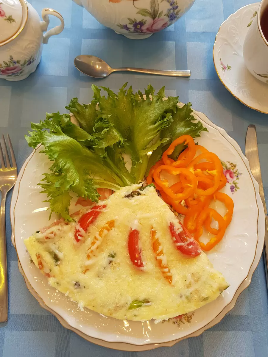 По завершении запекания дать фриттате немного остыть, а затем нарезать и подать на листьях салата, украшенными сладким перцем.