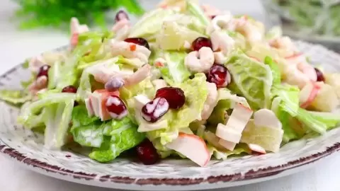 Креветки, содержащие много белка, йода и полезных омега-3 жирных кислот, вместе с крабовыми палочками и свежими овощами создают сбалансированное по питательным веществам блюдо. Гранат же добавляет не только привлекательного внешнего вида, но и насыщает организм витаминами и антиоксидантами.