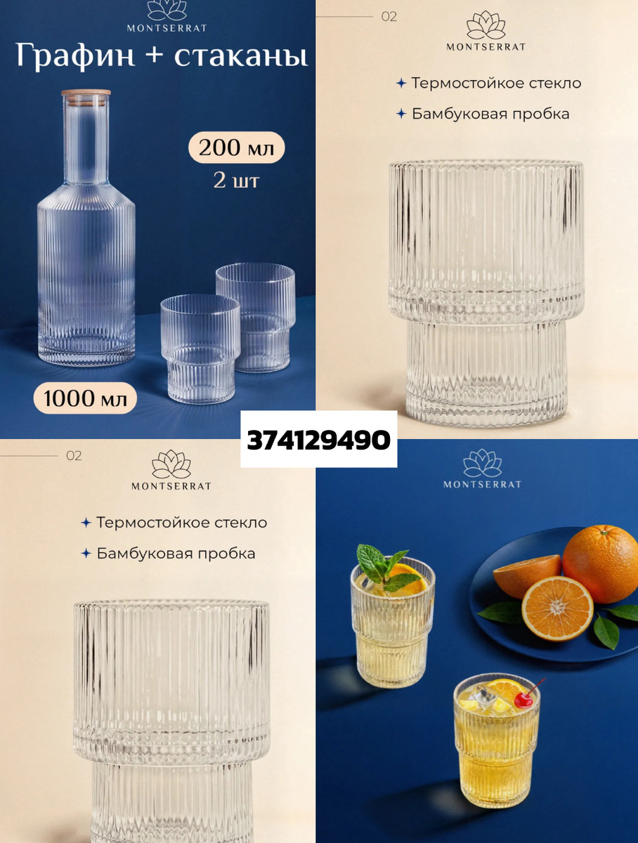 Первое, что стоит отметить, это современный набор графина и стаканов из рифленого термостекла (арт. 374129490). Такой комплект не просто выглядит шикарно: графин объемом 1000 мл сохраняет идеальную температуру напитков, а рифление эффектно преломляет свет, подчеркивая ваш выбор освежающих ликеров или вечерних коктейлей.