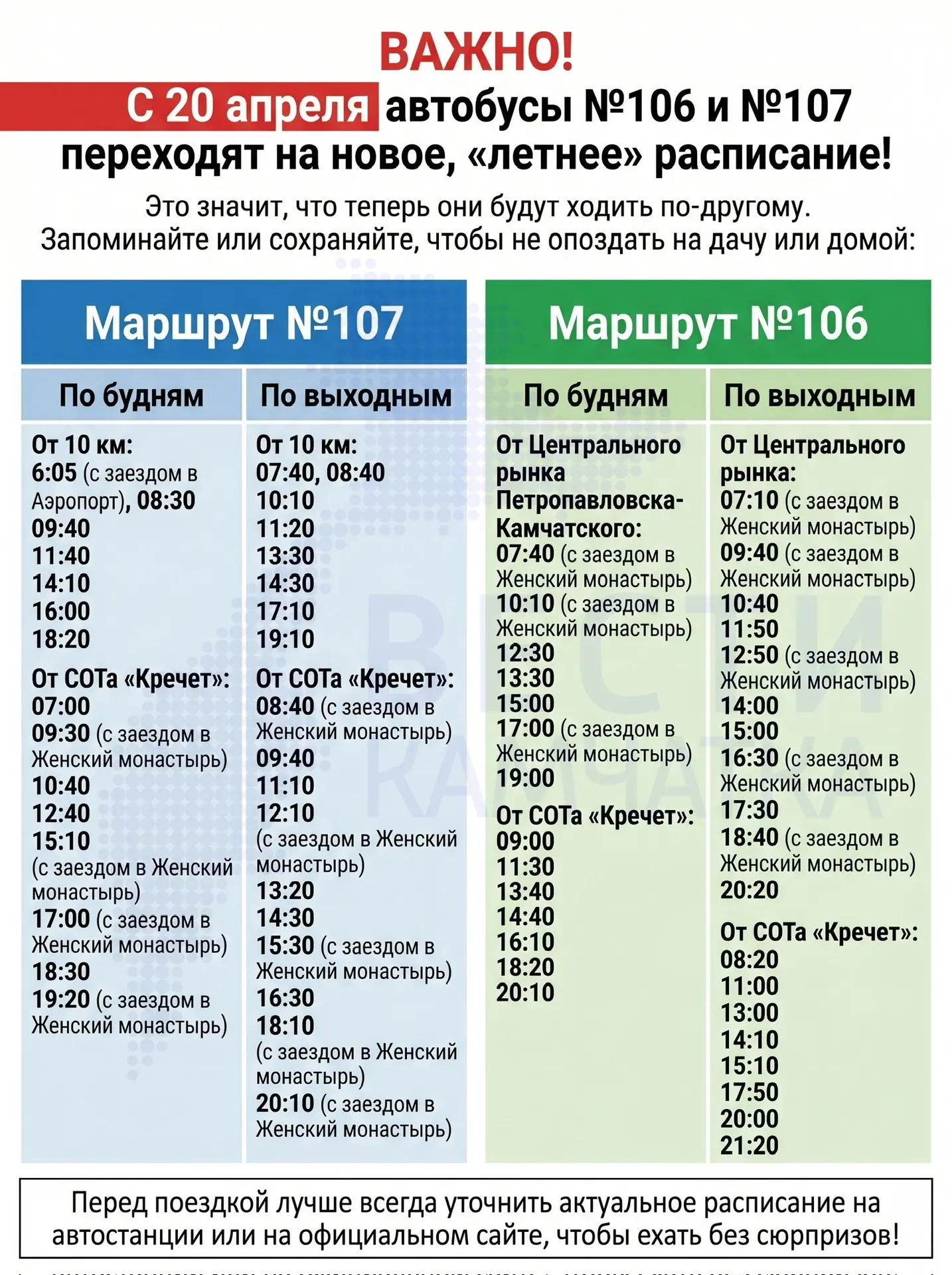Внимание! Обновленное расписание №107 и №106 автобуса на 2026 год, от 20 апреля, сохраняйте, чтобы не потерять! И делитесь со своими знакомыми дачниками!