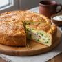 Подготовьте форму для выпечки, смазав ее сливочным маслом. Вылейте половину теста, затем аккуратно разложите начинку и закройте оставшимся тестом. Выпекайте в разогретой духовке около 35–40 минут, пока пирог не станет золотистым. Готовность можно проверить, проколов центр деревянной шпажкой. Если она выходит сухой, значит, пирог готов!