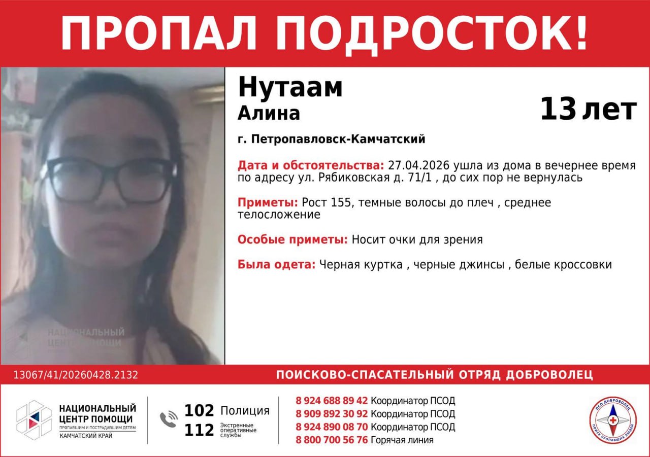 В Петропавловске-Камчатском пропала 13-летняя Алина Нутаам, которая вечером 27 апреля ушла из дома по улице Рябиковская 71/1 и до сих пор ее местоположение неизвестно.