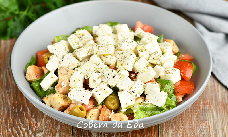 Смешать нарезанную курицу с заправкой, посолить и объединить все ингредиенты, переносить на сервировочную тарелку. Для оформления добавить на салат также кубики брынзы (170 г), посыпать травами и немного полить растительным маслом.