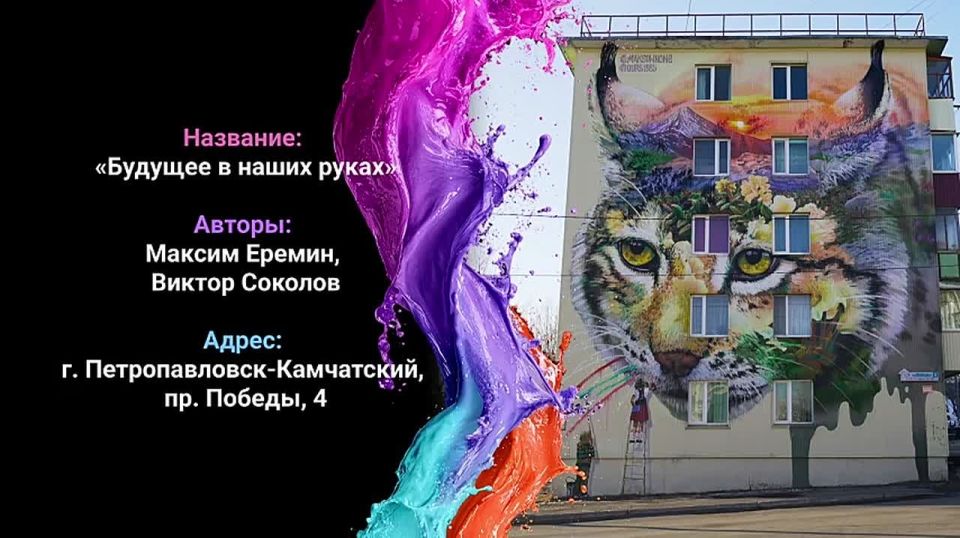 На изображении предстает рысь, которая охватывает красоту камчатских пейзажей: цветы, вулканы и закат. Создается впечатление, что через глаза дикой кошки вселенная наблюдает за зрителем. Внизу картины можно увидеть озорных детей...